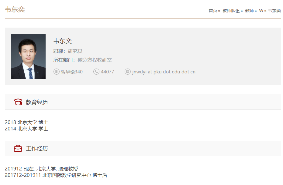 此前,网友对韦东奕职务职称问题的讨论度也很高。8月1日,北京大学数学科学学院官网显示 ,韦东奕2017年12月至2019年11月为北京国际数学研究中心博士后,2019年至今任北京大学助理教授。其所在部门为微分方程教研室,职称为研究员。