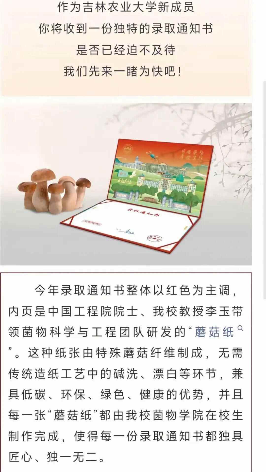 据该校官方微信显示,今年录取通知书整体以红色为主调,内页是中国工程院院士、吉林农业大学教授李玉带领菌物科学与工程团队研发的“蘑菇纸”。