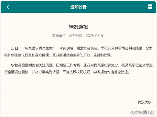 近日,“杨某某诉肖某某案”一审判决后,引发社会关注。学校充分尊重司法判决结果,全力维护学生合法权益和身心健康,真诚感谢社会各界的关心、监督和批评。