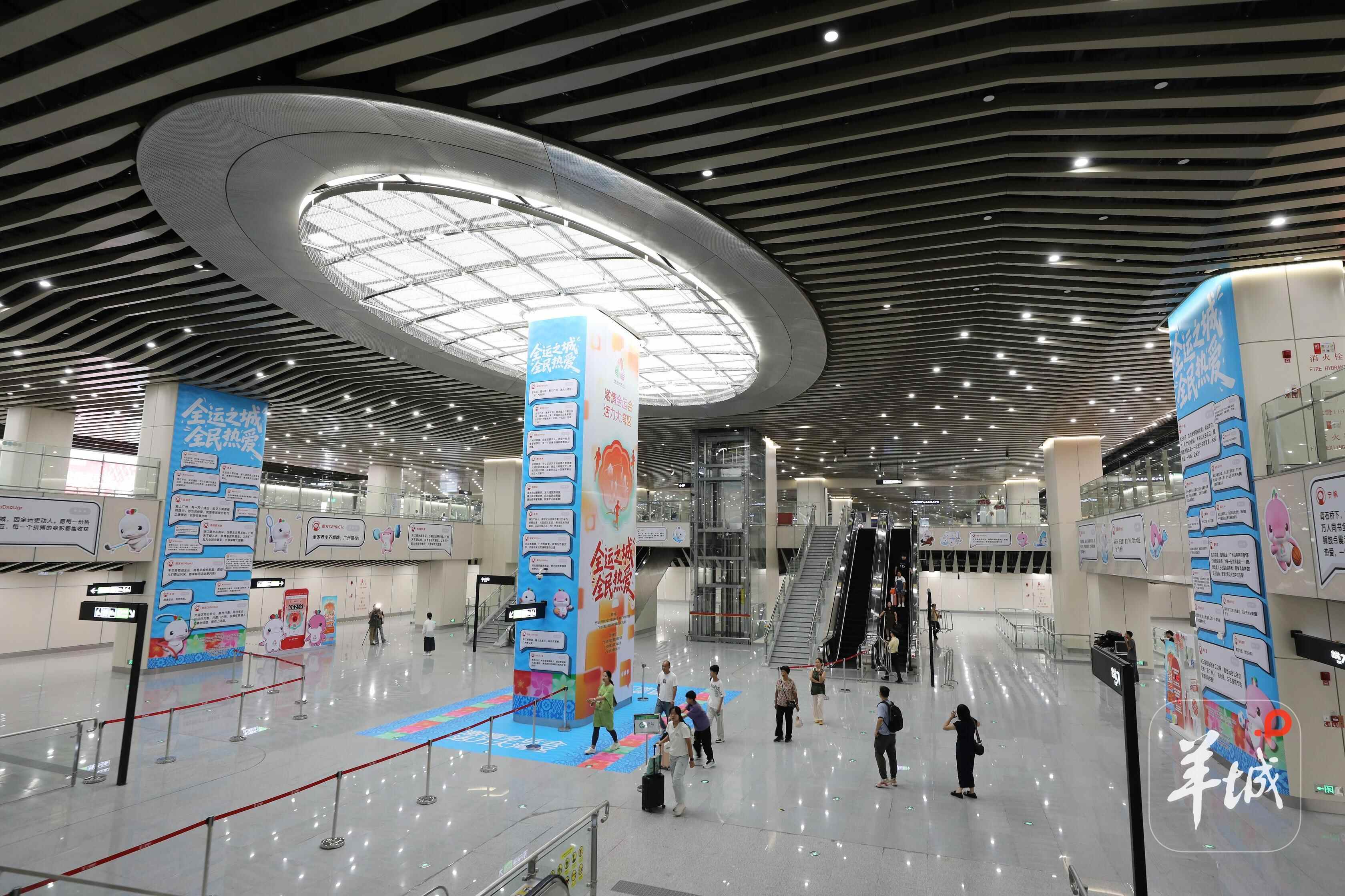 地铁广州白云站与铁路广州白云站相衔接,是展示广州形象的门户与窗口。地铁站厅内高达10米的立柱排列展示市民的留言,一句句祝福语与十五运会和残特奥会吉祥物“喜洋洋”“乐融融”贴画环绕四周,为市民营造沉浸式感受“激情全运会,活力大湾区”魅力的公共空间。据悉,地铁广州白云站内的十五运会祝福打卡墙将持续至残特奥会结束。