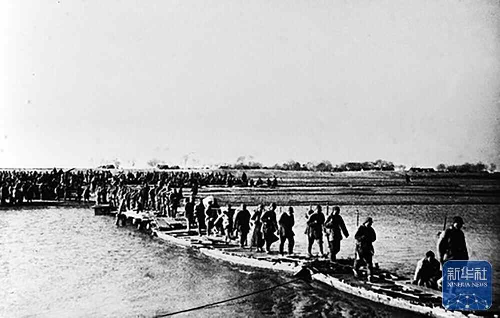 1945年9月,新四军参加淮阴战役的部队通过运河浮桥(资料照片)。新华社发