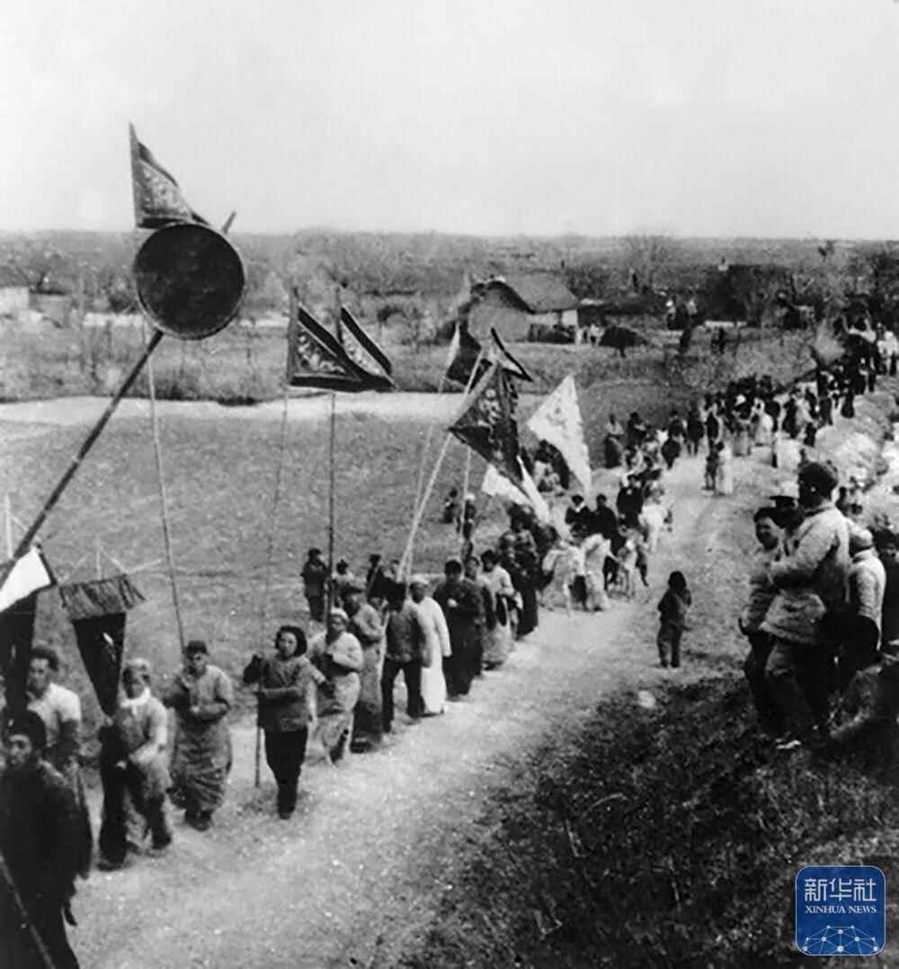 1943年冬,在苏北抗日根据地,群众纷纷将自己的子弟送到新四军中(资料照片)。新华社发