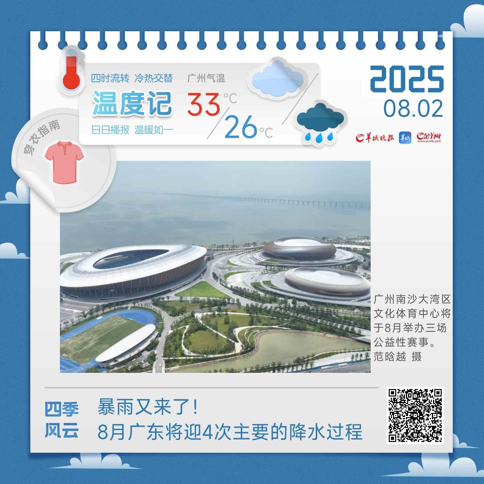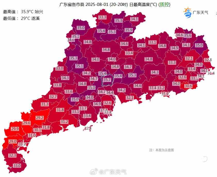 8月2日,广东省中南部市县有中到强雷雨局部大暴雨,其余市县多云有(雷)阵雨局地暴雨。最高气温:全省大部分市县介于30~34℃。