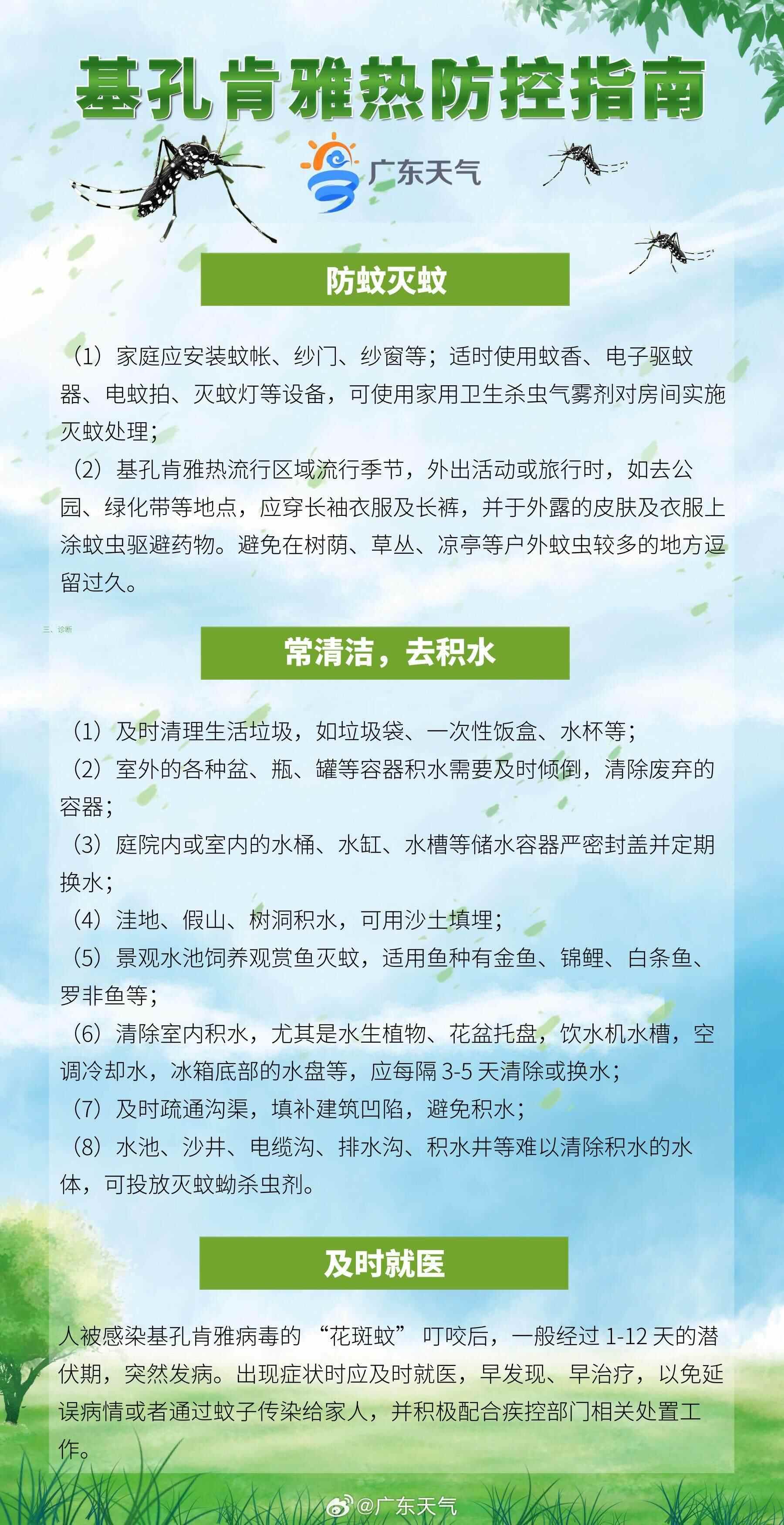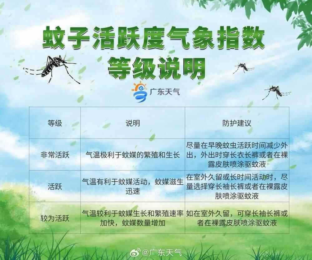 广东省气象、疾控部门提醒,近期蚊虫传播疾病多发,请公众要积极行动起来,及时清理家中及周边积水,安装纱门纱窗或使用蚊帐。气温变化影响蚊子活跃度,尤其在日出后2小时及日落前2小时为伊蚊活动高峰,请市民朋友做好防护措施,谨防蚊虫侵扰。