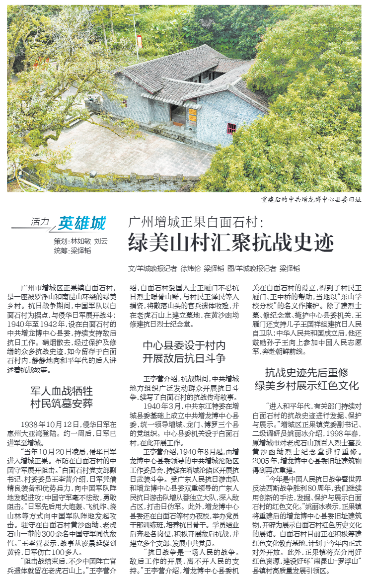 广州市增城区正果镇白面石村,是一座被罗浮山和南昆山环绕的绿美乡村。抗日战争期间,中国军队以白面石村为据点,与侵华日军展开战斗;1940年至1942年,设在白面石村的中共增龙博中心县委,持续支持敌后抗日工作。硝烟散去,经过保护及修缮的众多抗战史迹,如今留存于白面石村内,静静地向和平年代的后人讲述着抗战故事。