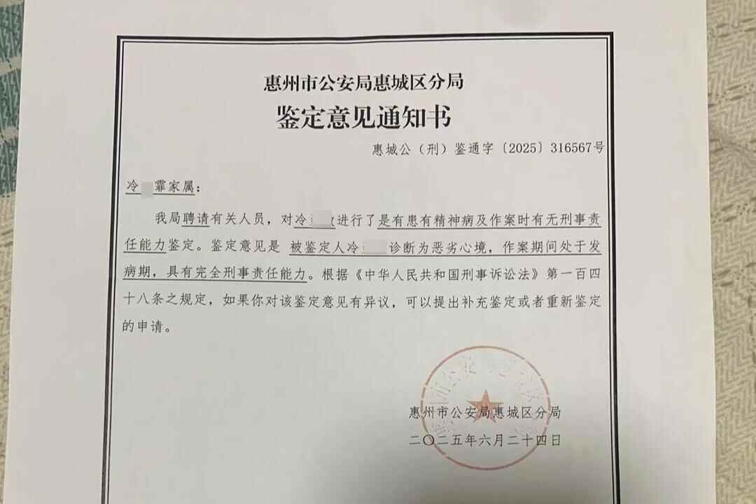 为了解哥哥的作案动机,事发后,冷先生申请对冷某敏做了两次精神鉴定。4月9日,惠州市公安局惠城区分局出具的鉴定意见通知书显示,冷某敏首次鉴定为“重度抑郁症发作,不伴有精神病症状”,作案时处于疾病的发病期,自知力完整,作案时的辨认能力和控制能力完整;第二次,6月24日,冷某敏被鉴定为“恶劣心境”。鉴定书指出,两次鉴定结果冷某敏均处于发病期,涉嫌故意杀人的行为均评定为“完全刑事责任能力”。