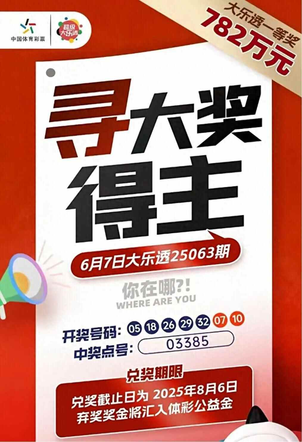 2025年6月7日,中国体育彩票超级大乐透第25063期开奖,武汉硚口区古田二路4201003385体彩销售点中出1注一等奖,开奖号码为05 18 26 29 32 07 10,中奖点号为03385奖金高达782万元,但中奖者却迟迟未现身领奖,引发持续关注。