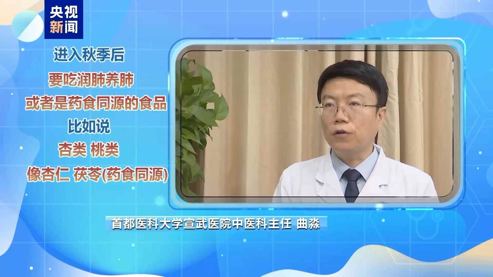 首都医科大学宣武医院中医科主任曲淼介绍,进入秋季以后,要吃润肺养肺或者是药食同源的食品,比如杏类、桃类的,像杏仁、茯苓(药食同源),另外还有秋梨等水果。