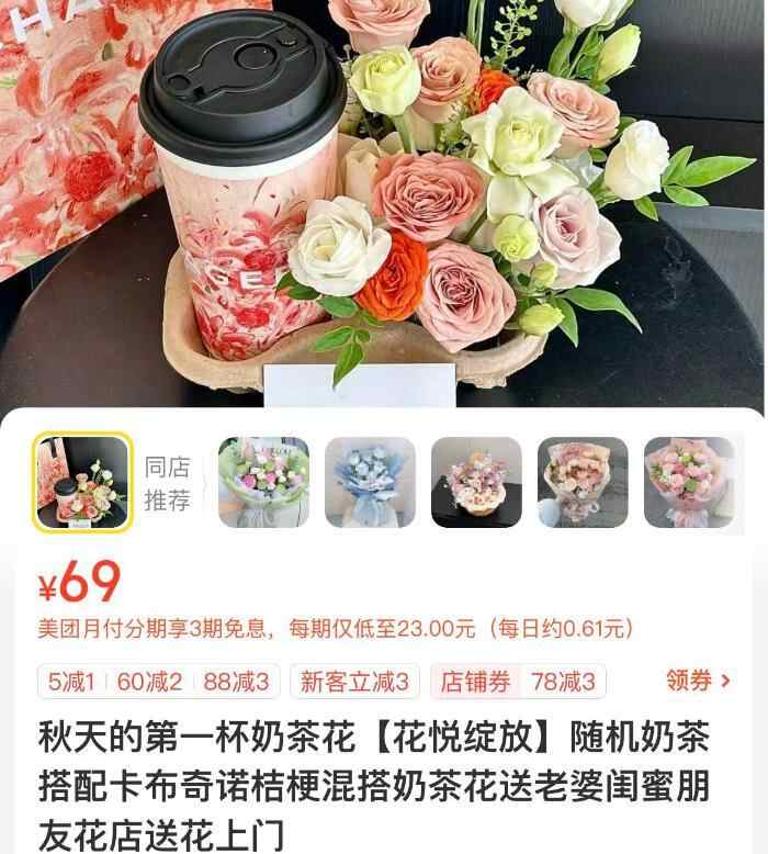 合肥市蜀山区一家花店在线上平台页面显示,“秋天的第一杯奶茶花”价格大约60元,3款玫瑰混搭奶茶。产品图片中,一杯奶茶放在已包装好的花束中。除了玫瑰花,还有其他品种的花朵搭配在一起。