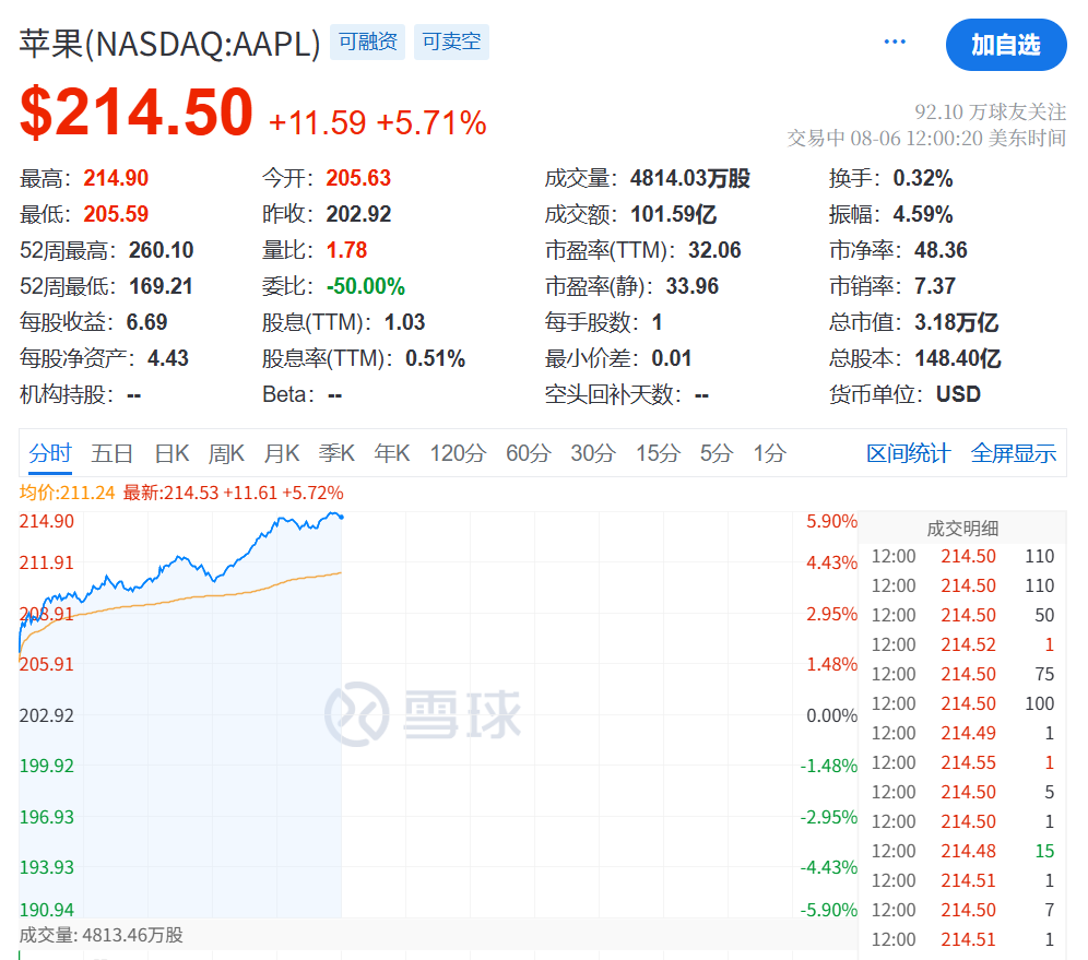 8月6日晚美股市场最引人注目的,应该是苹果公司股价暴涨超5%,创下了近几个月来最大涨幅。