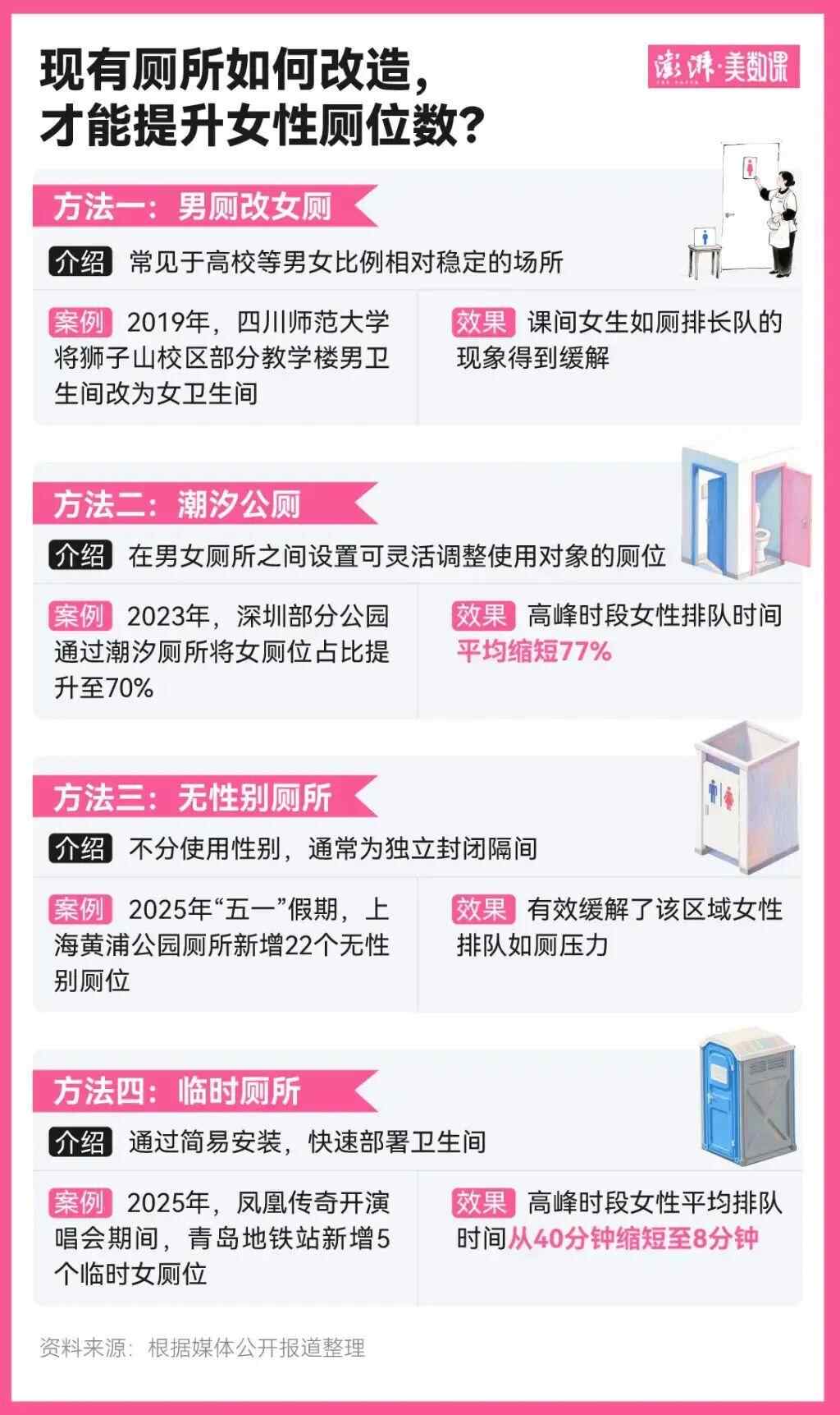 当然,解决女厕所排长队的难题,不只需要立法,还要看到执行层面的困难。新建厕所相对容易,只需设计阶段参照执行即可,但大量的现存设施怎么办?其往往受限于建筑结构、管道布局、空间不足等问题,很难调整到位。