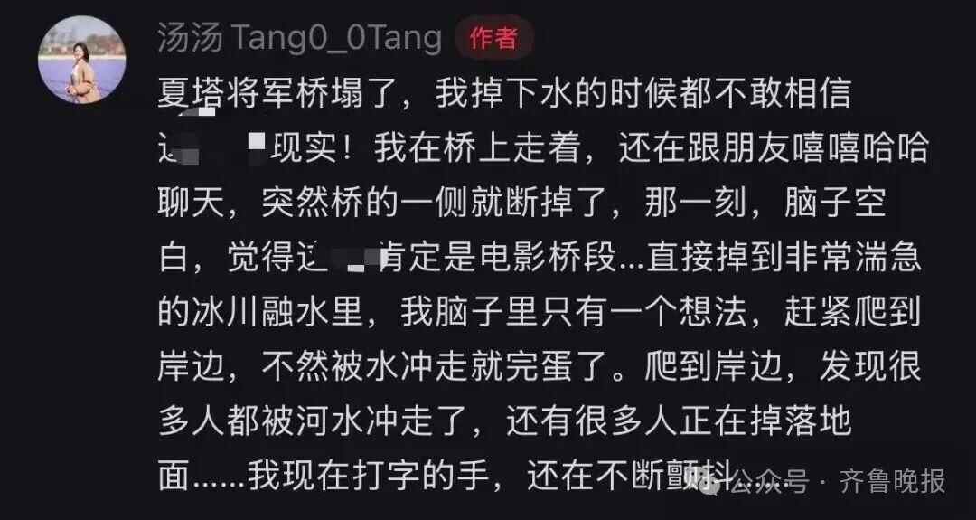 有网友表示,自己从桥上摔下,“我在桥上走着,还在跟朋友嘻嘻哈哈聊天,突然桥的一侧绳索就断掉了,那一刻,脑子空白……爬到岸边,发现很多人都被河水冲走了,还有很多人正在掉落地面,我现在打字的手,还在不断颤抖”。
