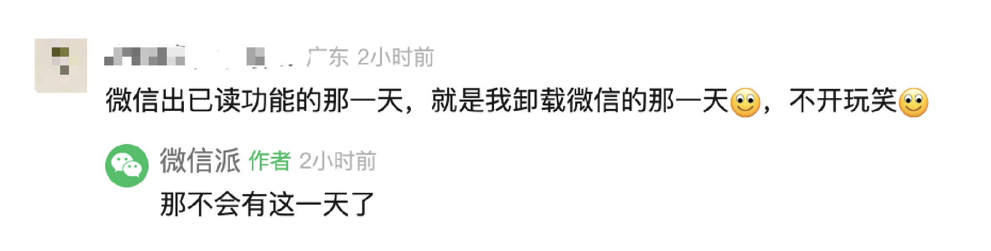 有网友留言:“微信出已读功能的那一天,就是我卸载微信的那一天。”微信则回应:“那不会有这一天了。”