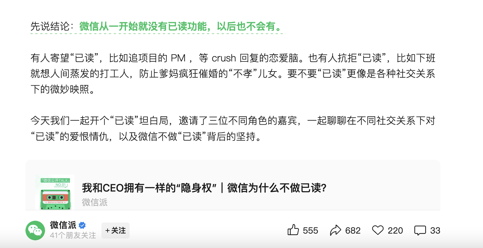 8月7日,微信发布推文《为什么微信没有已读功能?》。文中提到,“微信已读功能”时不时就掀起讨论,此前也多次辟谣。