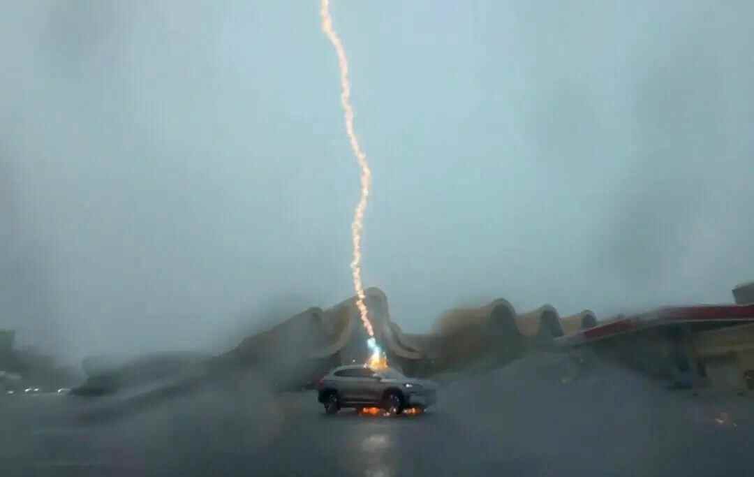 8月5日,有网友在广西北海铁山服务区记录了罕见一幕,一辆汽车正在缓慢行驶,突然被闪电从空中击中车顶。