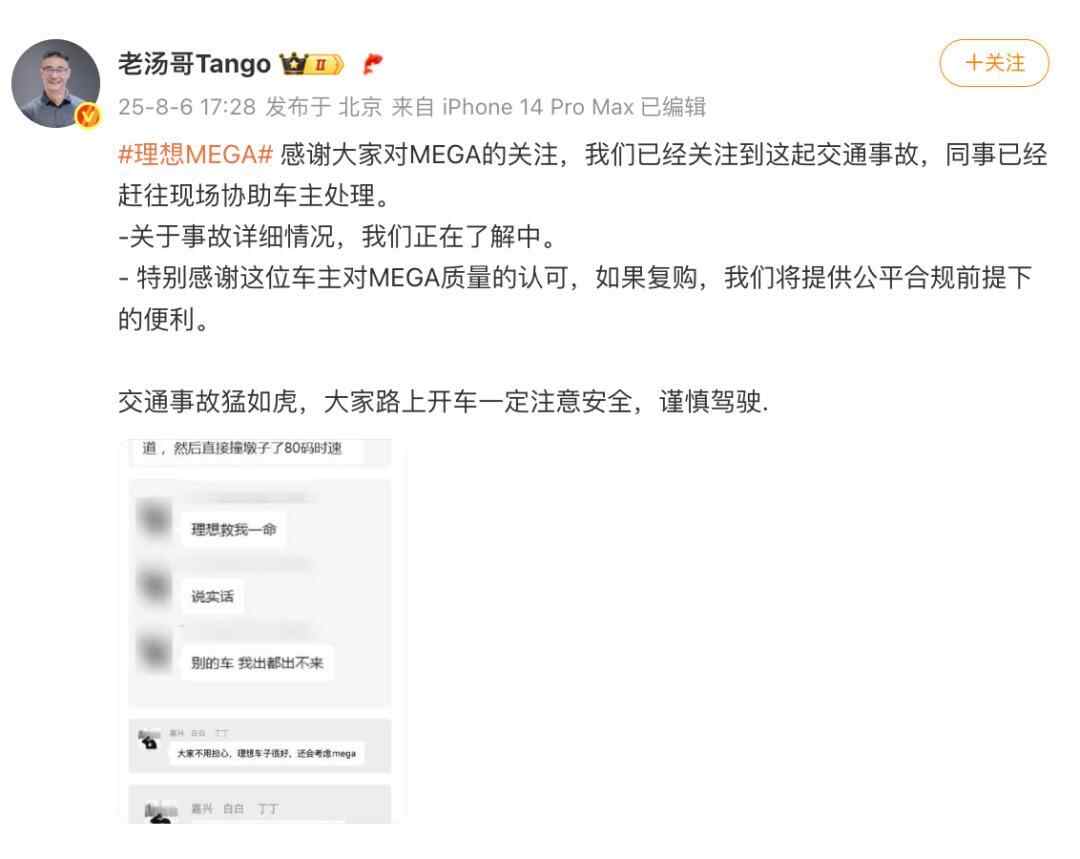 对此,理想汽车(02015.HK/LI.US)第一产品线总裁汤靖在微博上发文表示:感谢大家对MEGA的关注,我们已经关注到这起交通事故,同事已经赶往现场协助车主处理。关于事故详细情况,我们正在了解中。