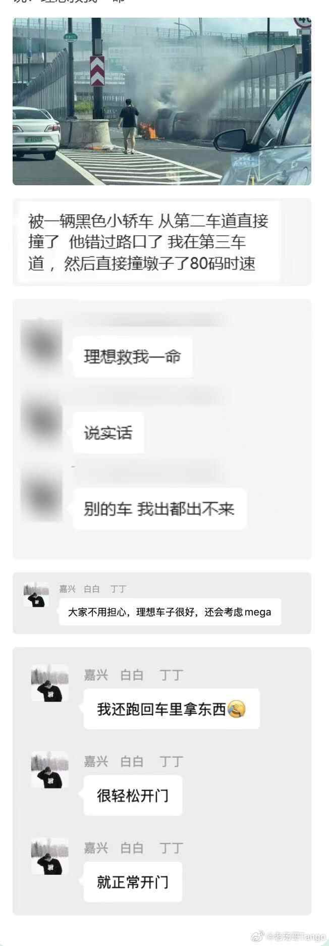 车主简单介绍了事故经过:一辆黑色小轿车从第二车道直接撞上了在第三车道的理想MEGA,理想MEGA直接撞上了墩子,时速80码。他表示,“理想救我一命,说实话,别的车我出都出不来。我还跑回车里拿东西,很轻松开门,正常开门。”