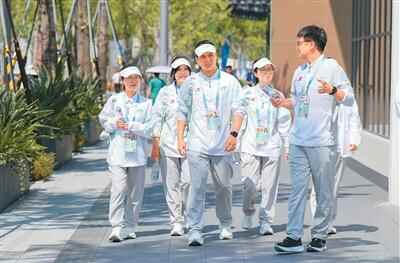 志愿者在成都世运会运动员村A区巡村。