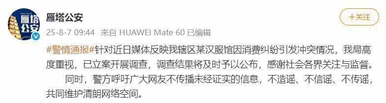 针对近日媒体反映我辖区某汉服馆因消费纠纷引发冲突情况,我局高度重视,已立案开展调查,调查结果将及时予以公布,感谢社会各界关注与监督。
