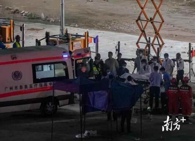 17时45分,救援人员用担架从现场抬出一名被困人员,并迅速送上救护车。据广州市白云区应急管理局消息,这名被困人员现场检查已无生命体征,经全力抢救无效死亡。