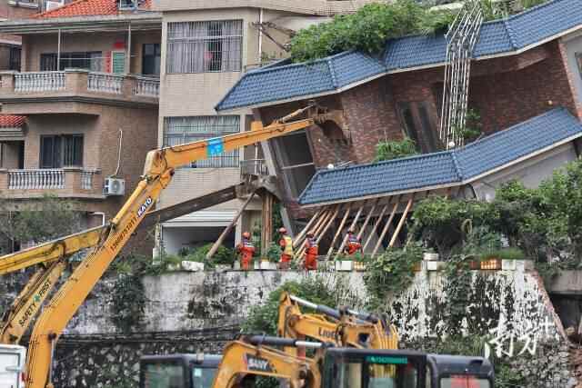 16时左右,救援工作人员正在用挖掘机顶住倾倒的房屋,随后用木头支撑住房屋。17时许,现场工作人员在确保安全的情况下,对倒塌的房屋进行搜救工作。