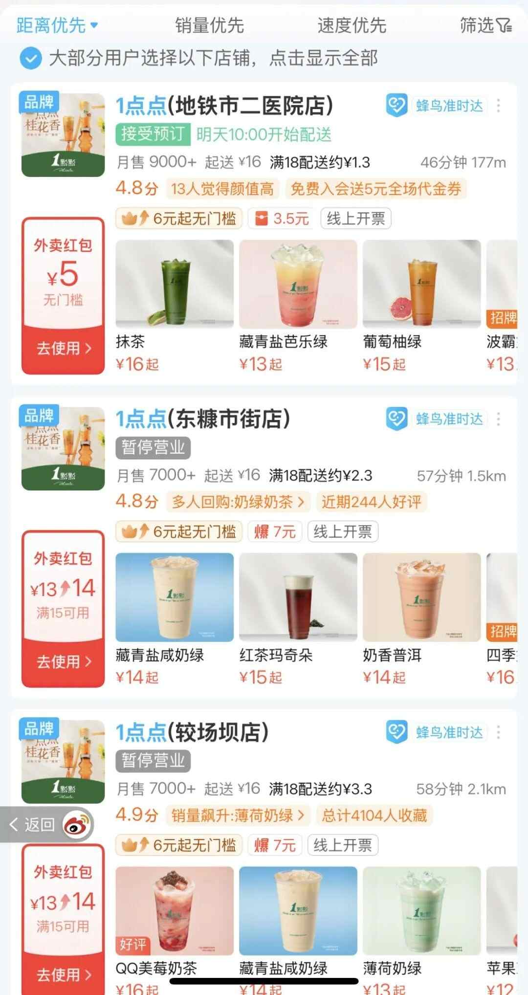 记者中午12:44搜索附近的奶茶店,发现多家显示“暂停营业”“接受预定”,配送时间显示为明天10:00开始。