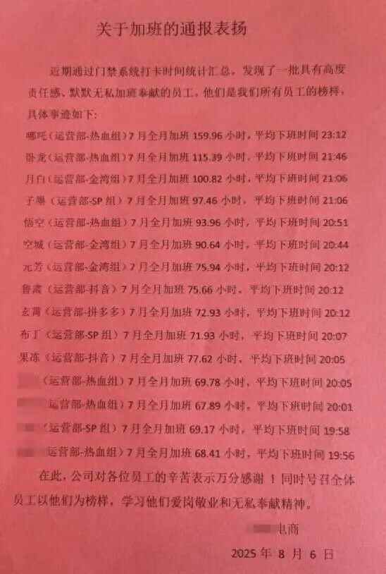 8月6日,有网友在社交平台贴出了一则《关于加班的通报表扬》。表扬信中,榜一员工加班159.96小时,平均下班时间为23:12。