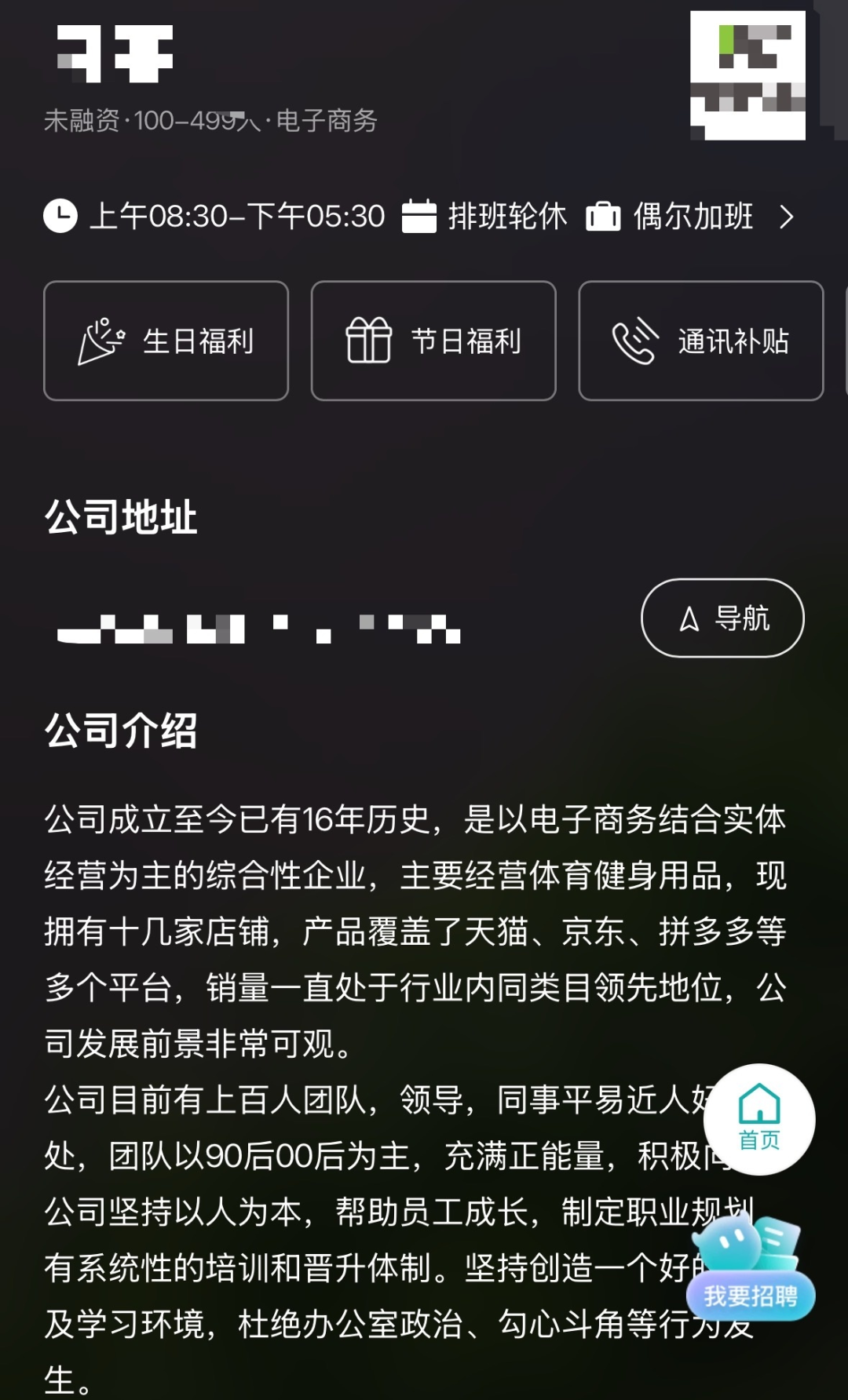 BOSS直聘网站上该电商公司主页显示,该公司注册于上海,成立至今已有16年,是以电子商务结合实体经营为主的综合性企业,公司目前有上百人团队。
