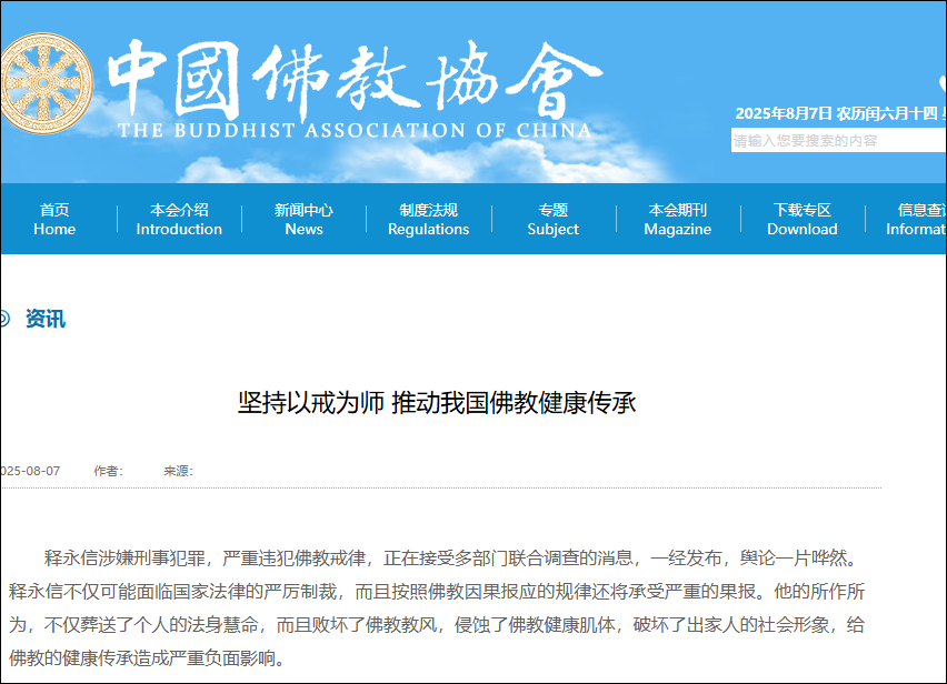 2025年8月7日,中国佛教协会发布《坚持以戒为师 推动我国佛教健康传承》一文,文章痛批释永信“对戒律毫无敬畏之心,放逸懈怠、追名逐利、贪图享乐,肆意破戒,堕入违法犯罪深渊”。称其行为“严重败坏佛教教风”,并警示全国佛教界引以为戒。