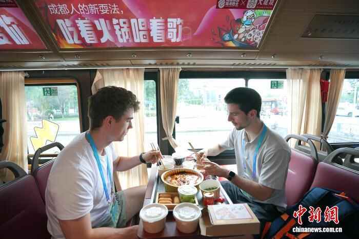 8月6日晚,在四川成都参加第12届世界运动会的外籍运动员等在火锅巴士上品成都火锅。 中新社记者 安源 摄