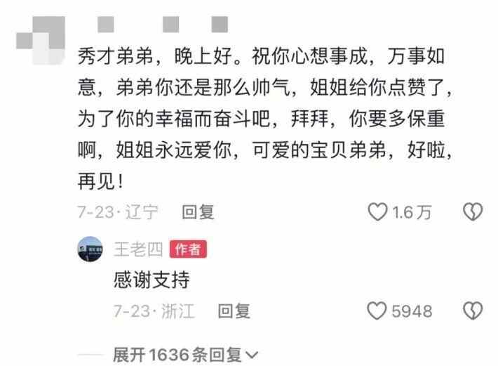这条7月23日发布的视频,目前已经获得超过41.4万赞,2.7万条留言,45.7万条转发。在评论区里,已经聚集了不少原来“秀才”的粉丝,且在一条“秀才”粉丝表达祝福的留言里,视频作者给予了回复:感谢支持。