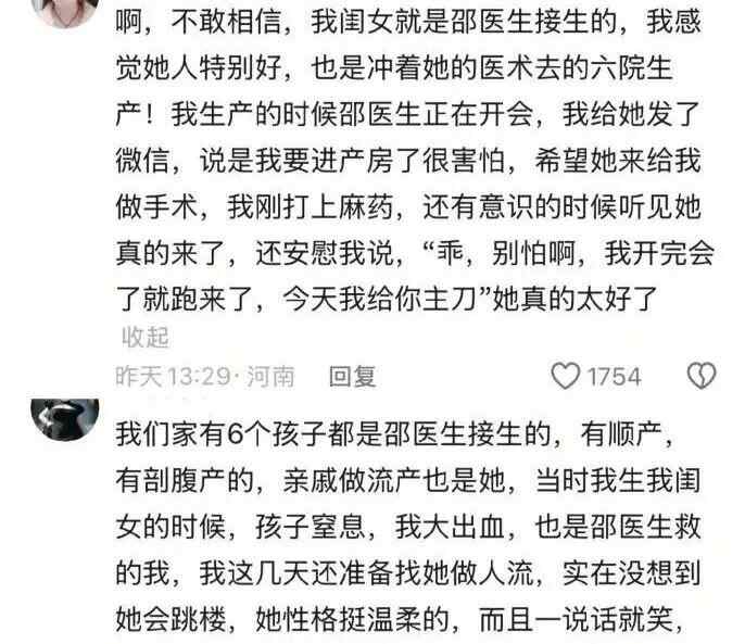 还有网友表示,去年她生孩子就是邵主任做的手术,在打麻药时因为害怕全身发抖,邵主任进来看到,双手抱着她的头安抚,又温柔又让人放心。
