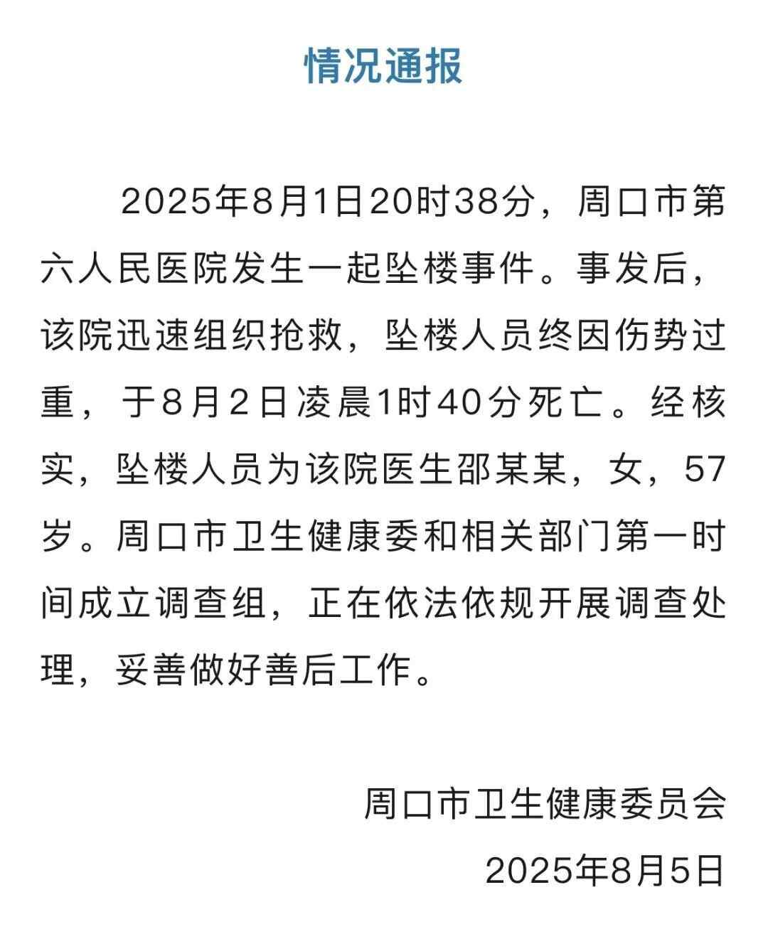近日,“周口市第六人民医院妇产科主任邵某某因长期遭受网络暴力跳楼身亡”一事引发广泛关注。多个社交媒体账号发布视频称邵医生系“求助无果、以死明志”。8月4日晚,邵医生的丈夫张先生(化名)向媒体证实了此事。目前,邵医生的遗体已经在老家下葬。