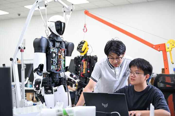 2025年5月29日,在位于湖北省武汉市的华中科技大学机械科学与工程学院,研究人员对“荆楚”人形机器人进行代码调试。新华社记者 杜子璇 摄