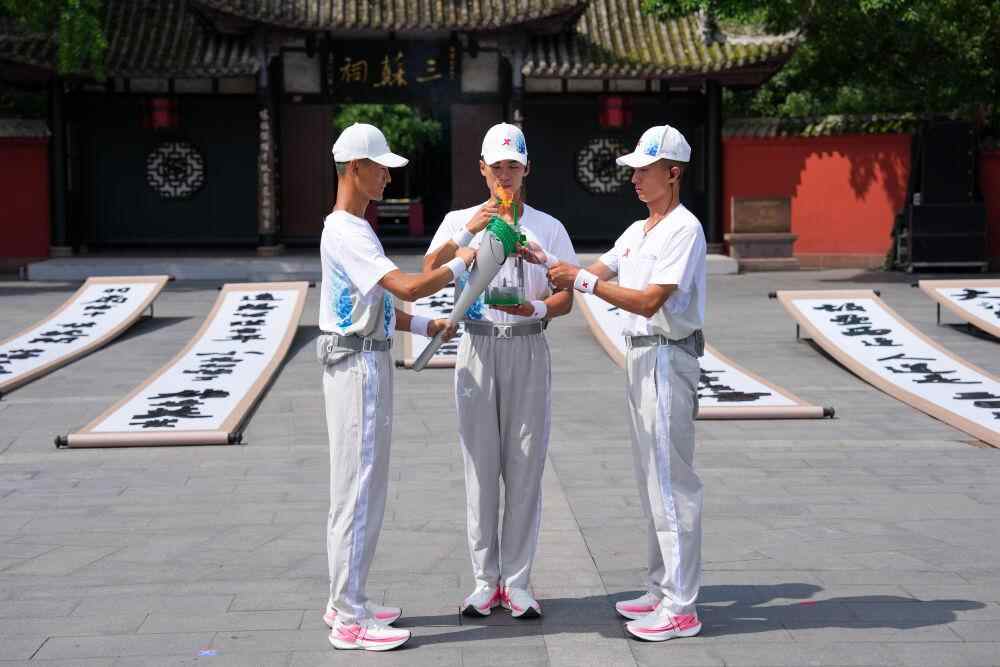 7月26日,火种护卫队员在眉山三苏祠进行点火仪式。当日,第十二届世界运动会火炬传递活动在四川举行。新华社记者 李旭伦 摄