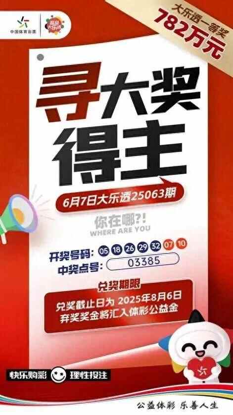 6月7日,中国体育彩票超级大乐透第25063期开奖,开奖号码为前区05 18 26 29 32,后区07 10。当期湖北武汉两家销售点各中1注一等奖,奖金782万元。