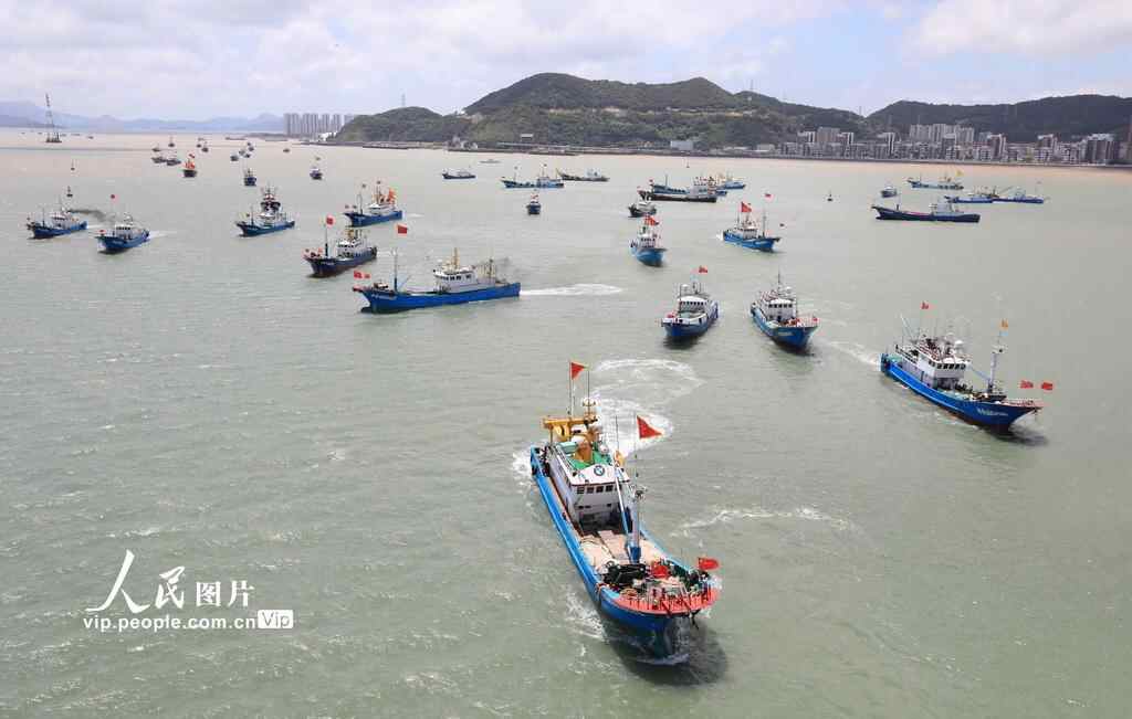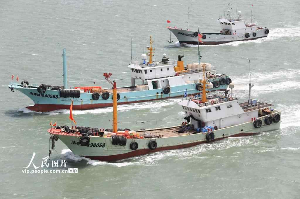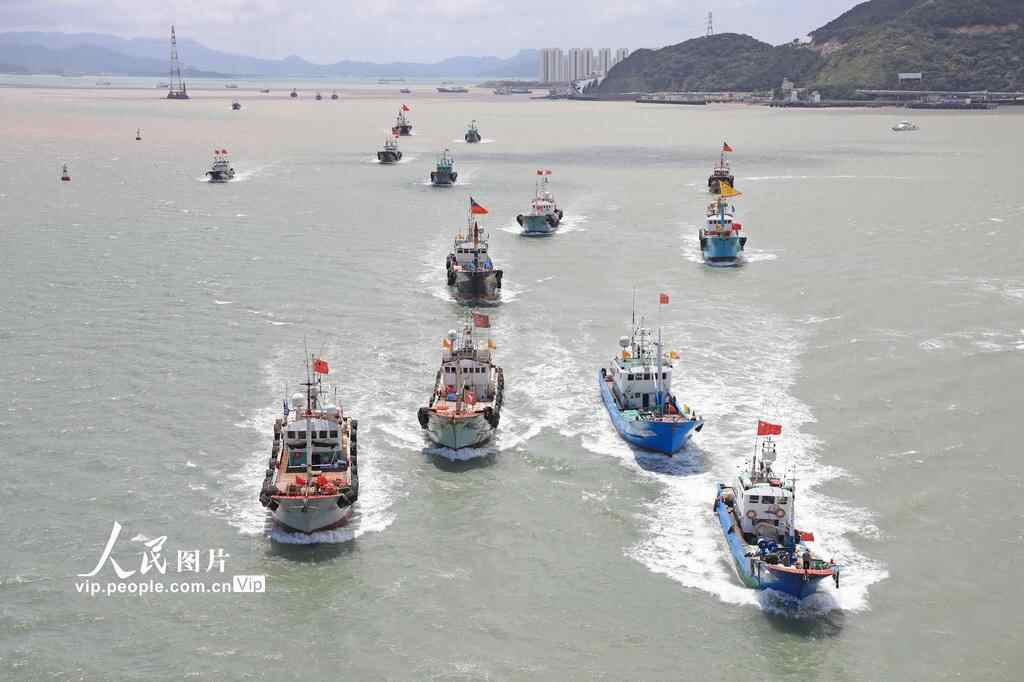2025年8月5日中午12时,浙江舟山,单船桁杆拖网、笼壶类、刺网和灯光围(敷)网4种作业类型渔船出海捕鱼。陈永建摄(人民图片网)