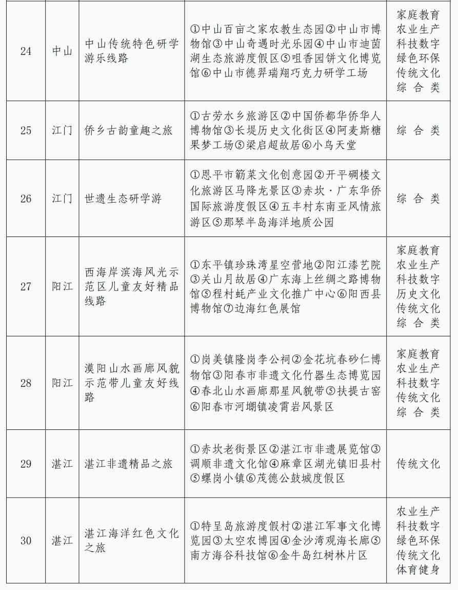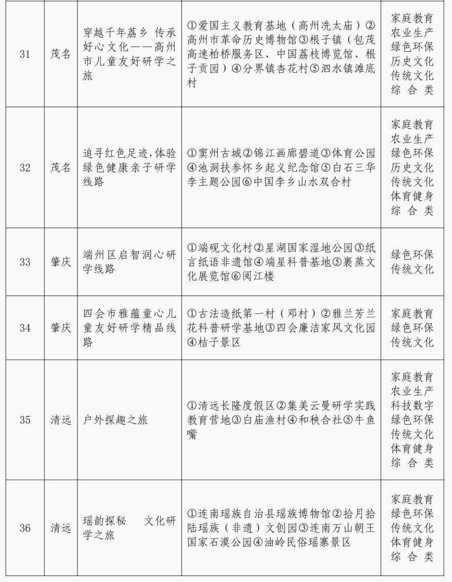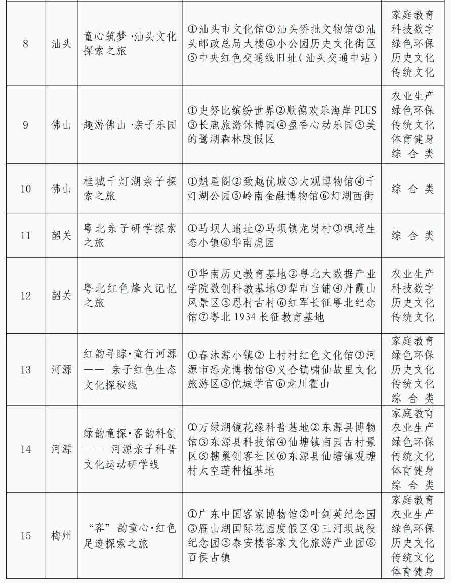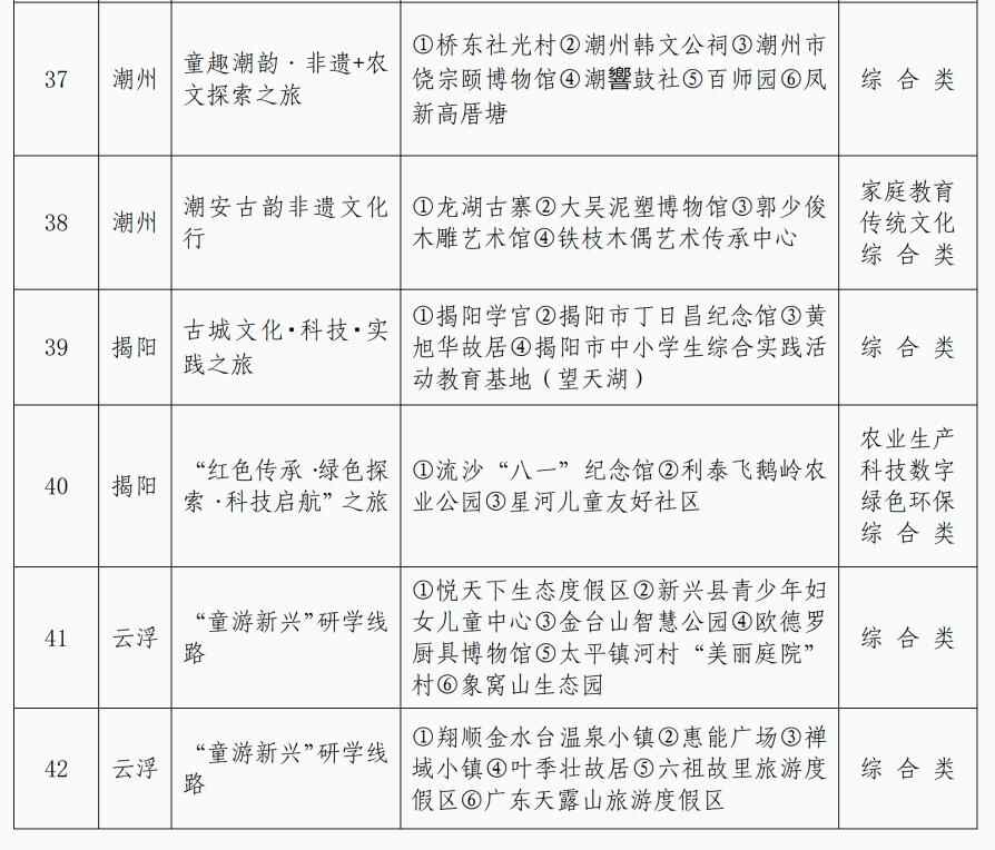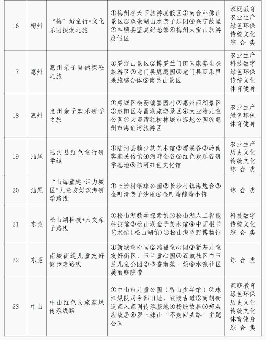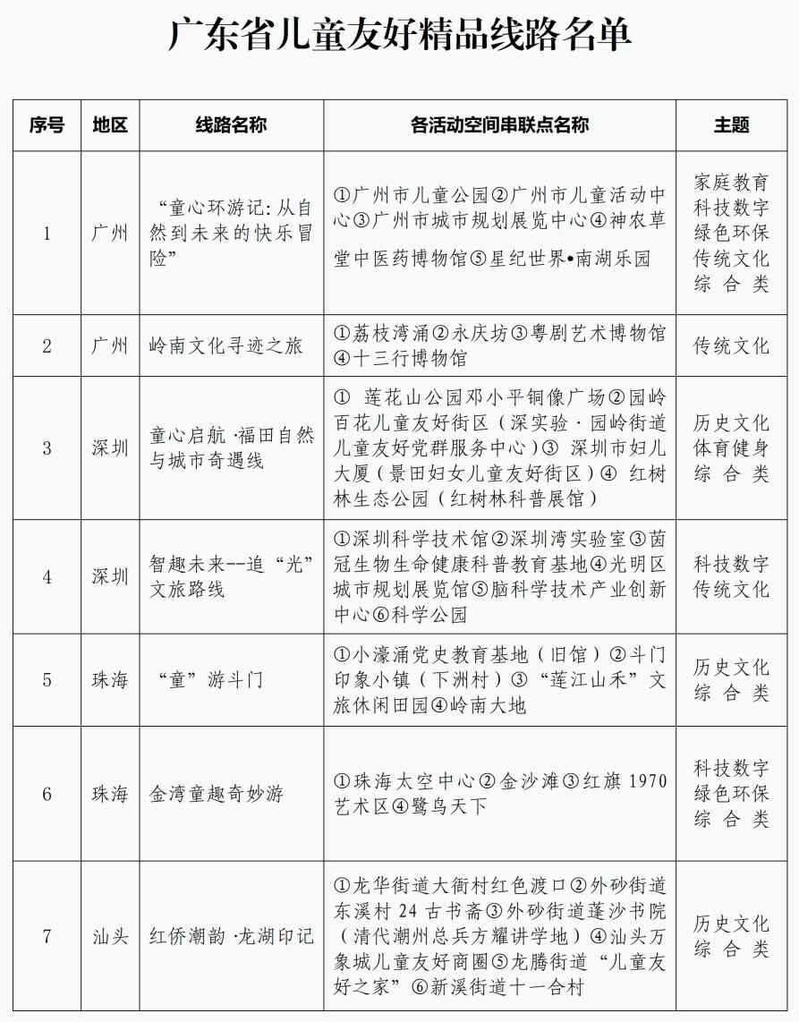 暑假已过半,孩子们还能去哪儿开心玩耍?记者获悉,近期,广东省妇女联合会精心策划开展广东省儿童友好精品线路征集,择优选出42条主题鲜明、寓教于行、安全便捷的儿童友好精品路线,为广大家庭提供集安全性、教育性、趣味性、便捷性等于一体的亲子出行新选择。具体路线详见表格: