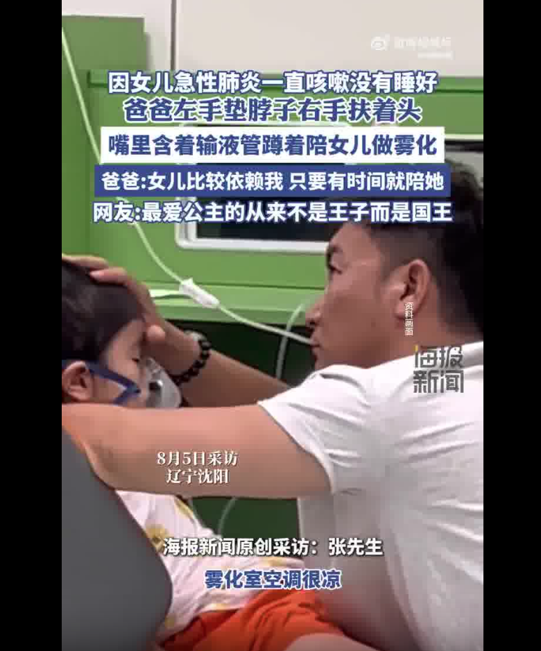 8月5日,在辽宁沈阳。因女儿急性肺炎一直咳嗽没有睡好,一位爸爸左手垫脖子者手扶着头,嘴里含着输液管蹲着陪女儿做雾化。