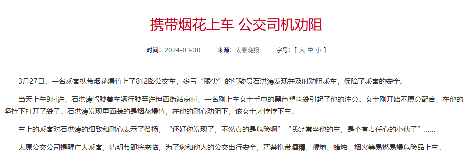 去年3月,有乘客携带烟花上车,被公交驾驶员及时劝阻。
