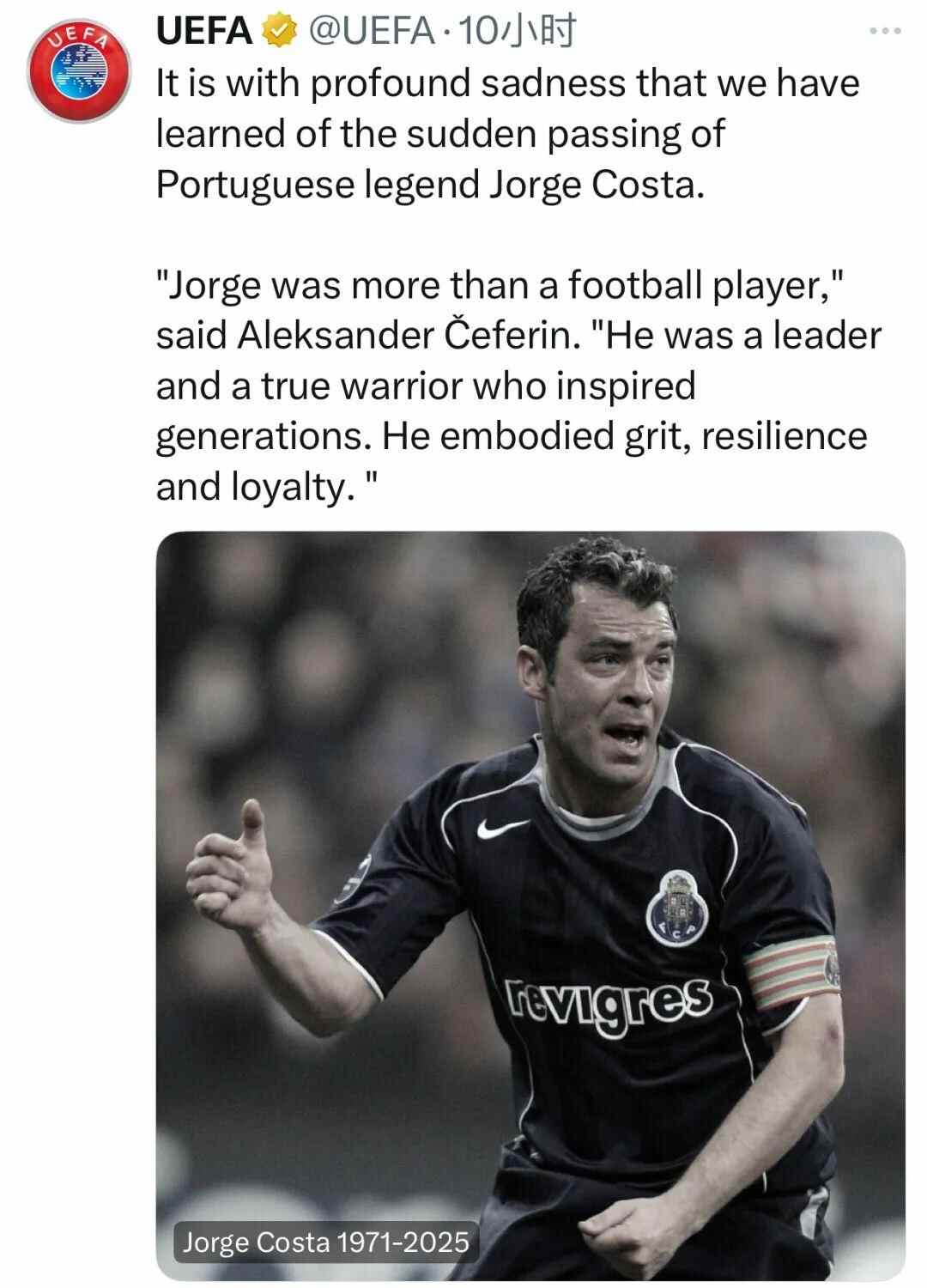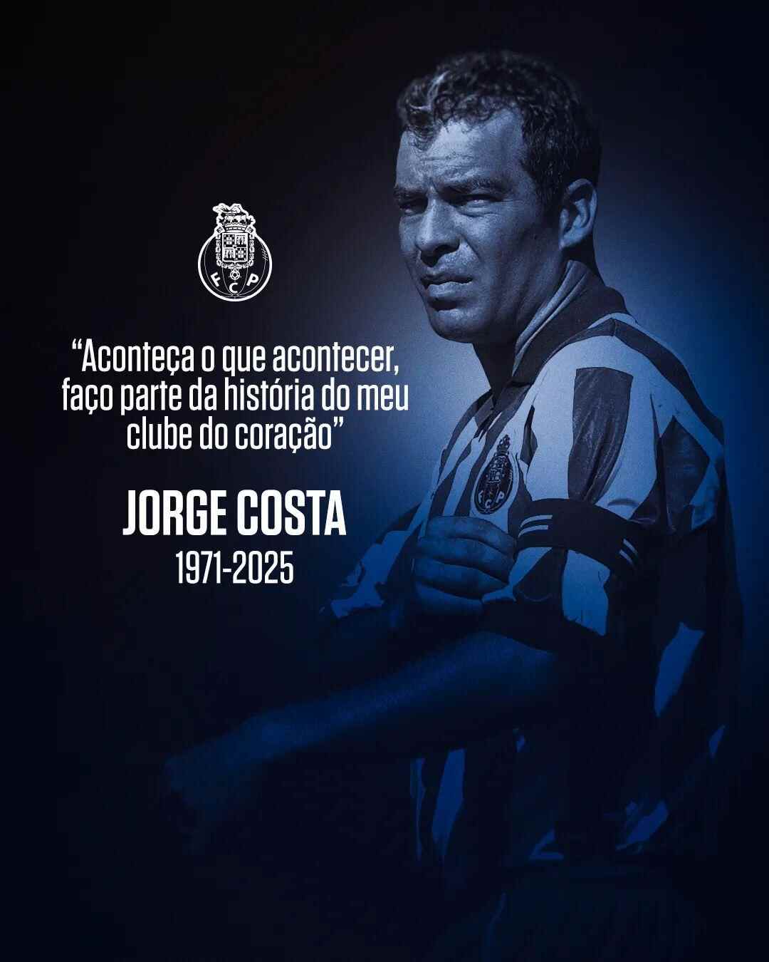 波尔图俱乐部官方社交媒体发文悼念这位俱乐部传奇人物:“若热·科斯塔离开了我们。他是我们中的一员,一位领袖,一位队长,一位榜样。他是波尔图足球俱乐部的象征。感谢你们一直支持波尔图直至最后。再见,若热·科斯塔。”