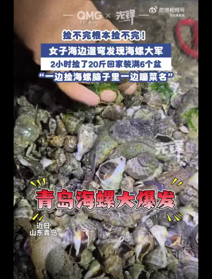 近日,山东青岛。青岛海螺迎来“丰收日”,捡不完!根本捡不完!女子海边遛弯忽然发现海螺大爆发,随即开启“沉浸式捡海螺”模式,2小时捡了20斤回家装满6个盆!