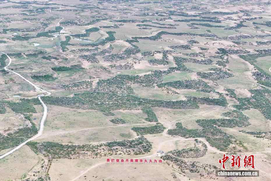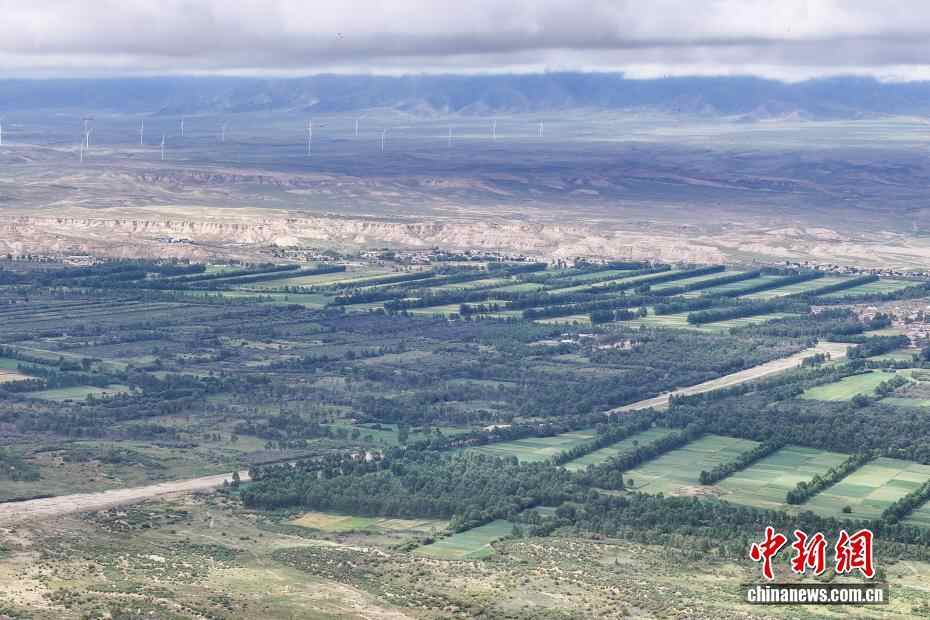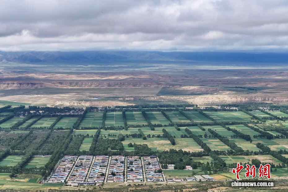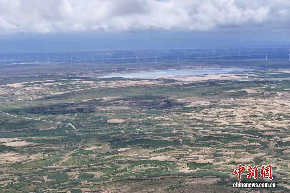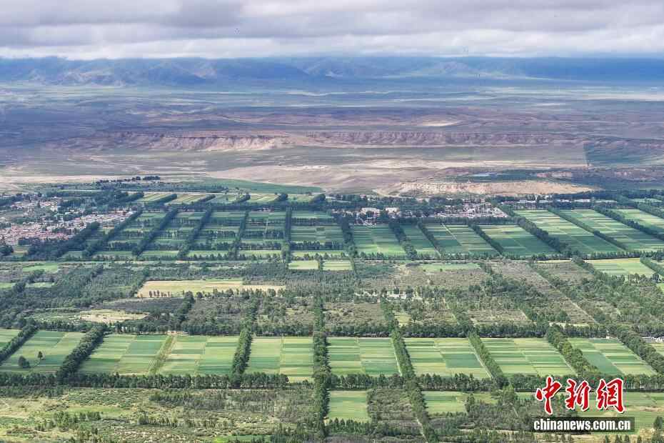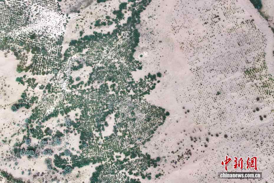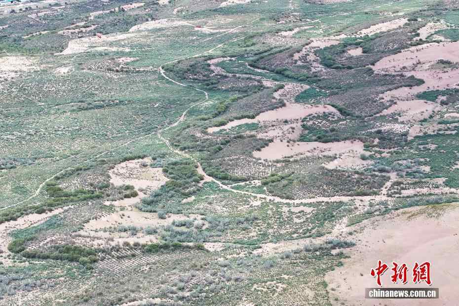 8月5日,航拍位于青海省海南藏族自治州共和县沙珠玉乡治沙现场。此处属青海省“三北”工程六期,通过“三北”工程40多年来的治理,让当地从“沙进人退”到“人进沙绿”,使得沙珠玉乡成为中国高寒干旱沙区治沙防沙示范样板。(无人机照片)