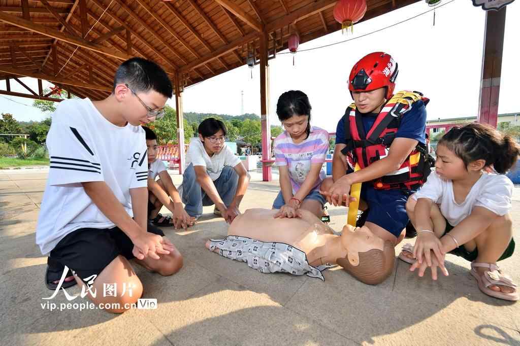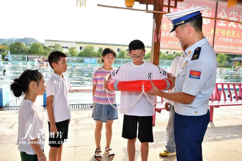 8月5日,消防员为学生讲解救生圈的使用方法。