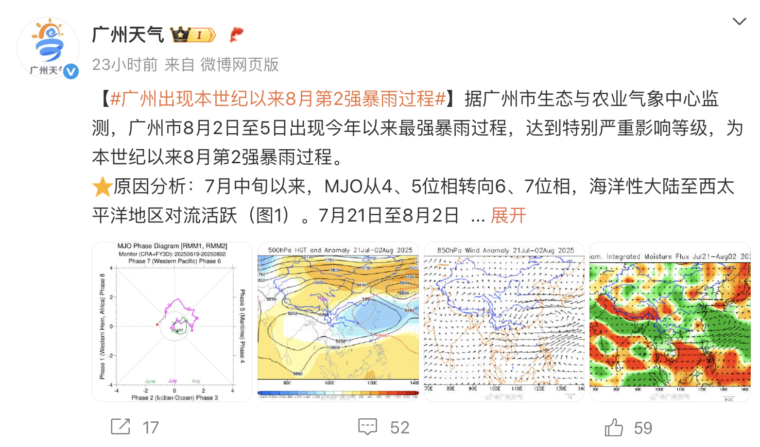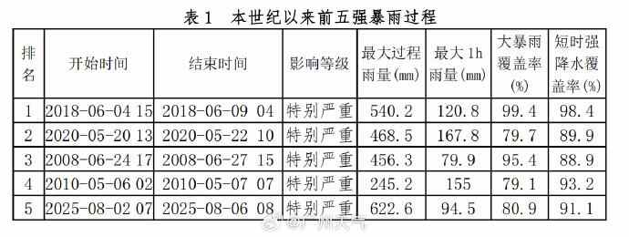 8月6日,@广州天气发布消息称,据广州市生态与农业气象中心监测,8月2日至6日出现今年以来最强暴雨过程,已经达到特别严重影响等级,为本世纪以来第5强。