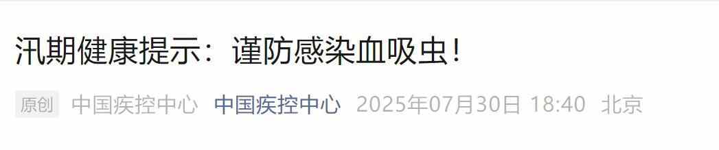 中国疾控中心发布紧急提醒,汛期在洪涝区域及水沟、沼泽和芦苇滩等地活动,应谨防血吸虫感染。