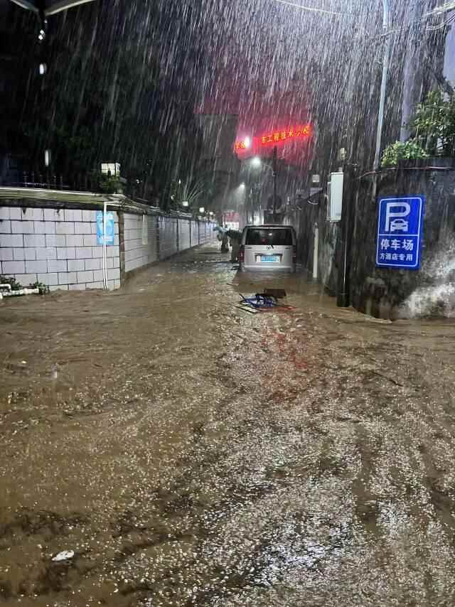 当晚,看着雨越下越大,洪水逐渐上涨,刚吃完晚饭的罗振华和儿子一起从民宿走到家里的美食店看物资情况。途中,洪水已经齐膝盖深。从山上冲下来的洪水中,夹杂着垃圾桶、木头、商店门牌还有一个冰箱,“水急得很”。
