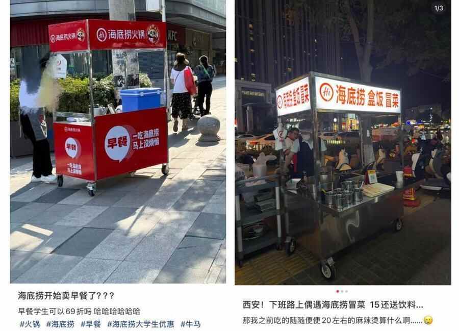 不仅是自助午餐,还有网友透露,海底捞部分城市的门店员工开始将卖早餐、盒饭和冒菜的餐车推到街头售卖。这些产品的价格也相对亲民,比如海底捞早餐的茶叶蛋的售价为1.5元/个,盒饭的售价则普遍在15元/左右。