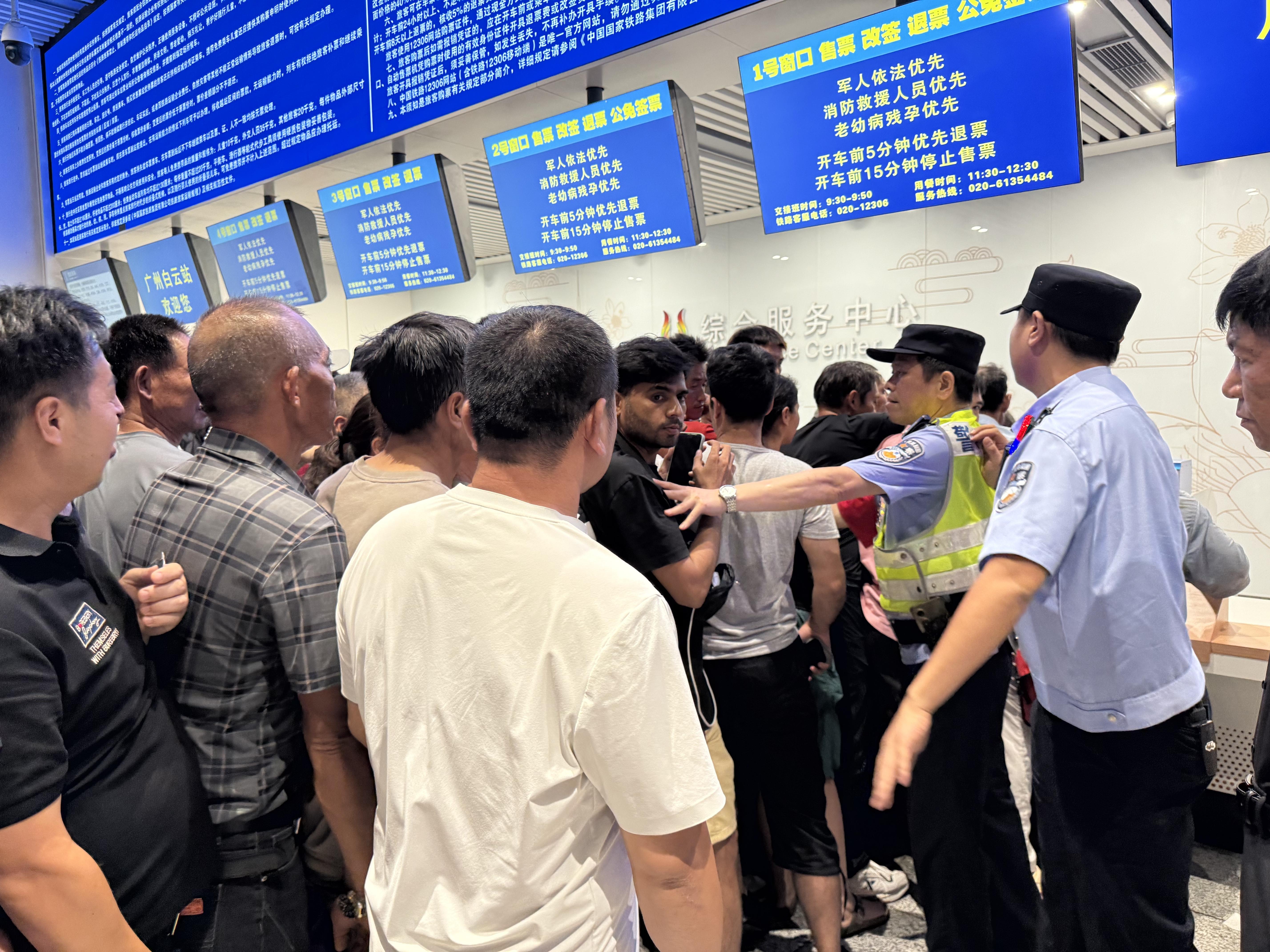 8月5日,受粤北暴雨影响,广州白云站40余趟列车停运。面对这一突发情况,广州白云站派出所迅速响应,立即启动应急预案,强化与车站客运及广州市公安局白云分局白云站派出所联勤联动,共同应对汛情。一方面,对接售票处增派警力,维护秩序,耐心安抚旅客焦急情绪,协调解决车票退改签问题;另一方面,对接客运部门对滞留客流全面盯控,加强巡逻管控和客流疏导,避免大规模人员聚集导致安全事故的发生,确保站场秩序平稳可控。