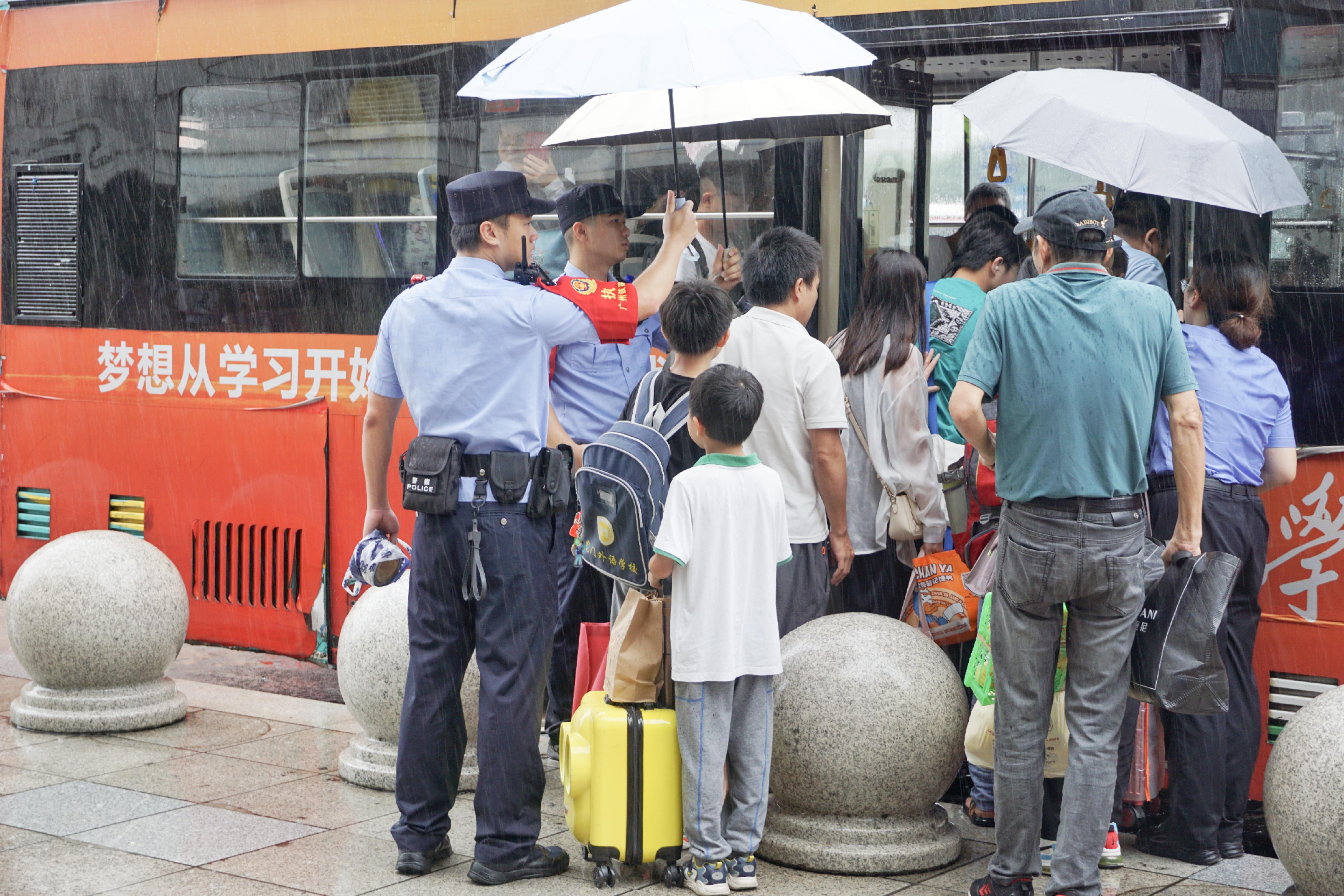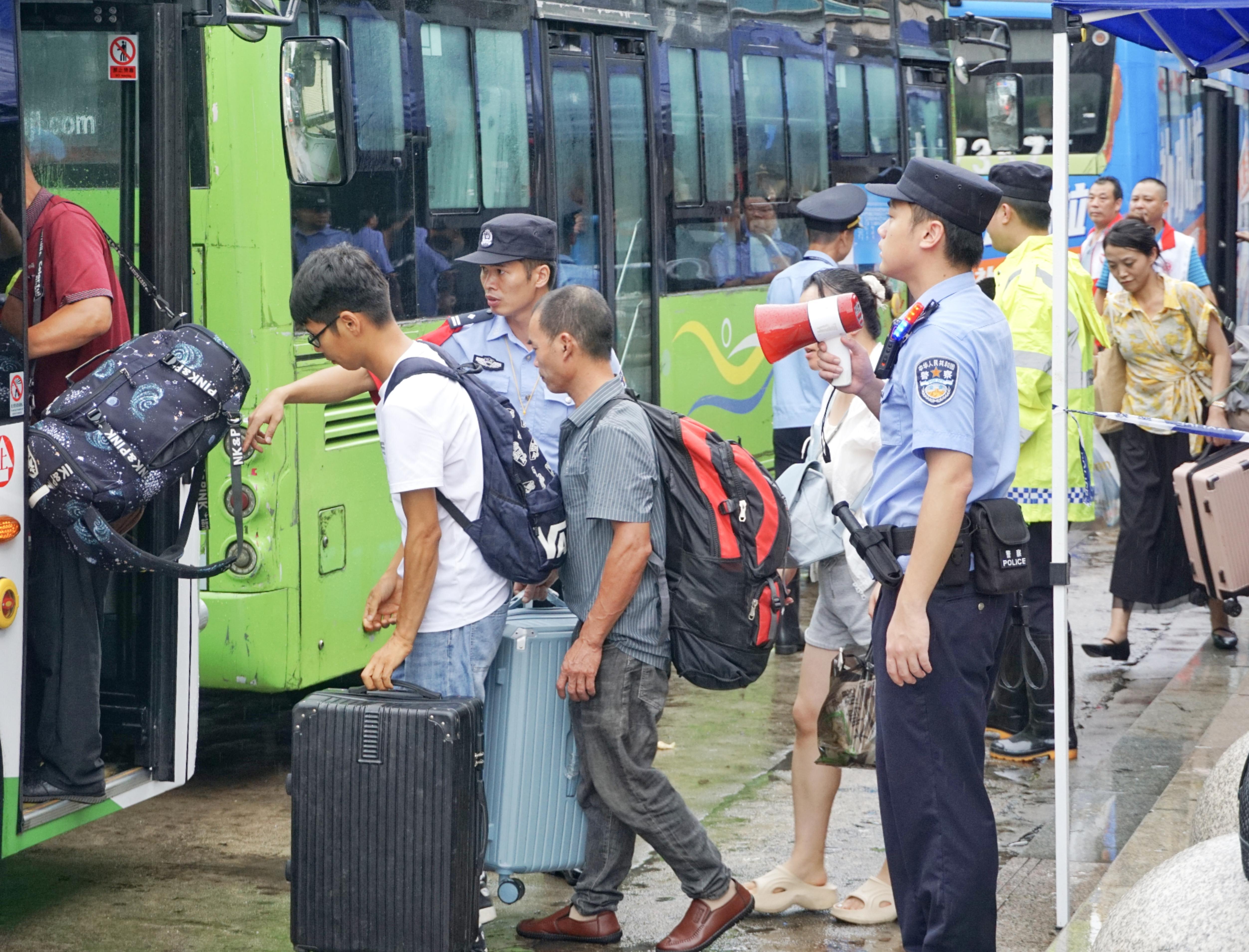12时许,雨势不断加大,旅客转运工作正式开始。韶关东站派出所15名民警在站台、地下通道、出站口疏导旅客出站,指引有序登乘转运公交车;派警组协同车站工作人员到候车室、卫生间进行人员清退,避免旅客错过通知导致滞留车站;其余民警与地方公安机关和客运人员开展联勤联动,将旅客有序转运至韶关高铁站,全方位为旅客保驾护航。